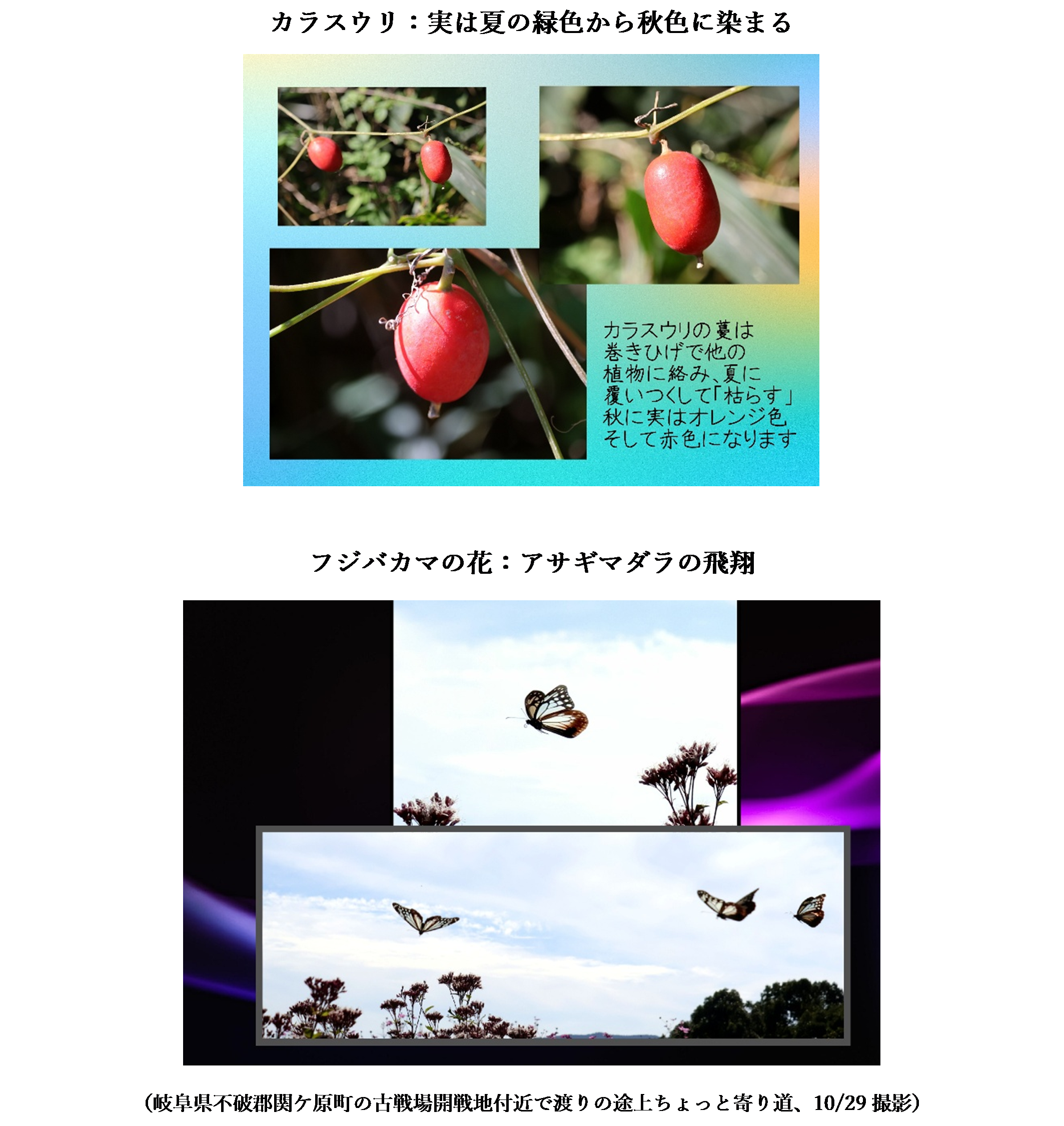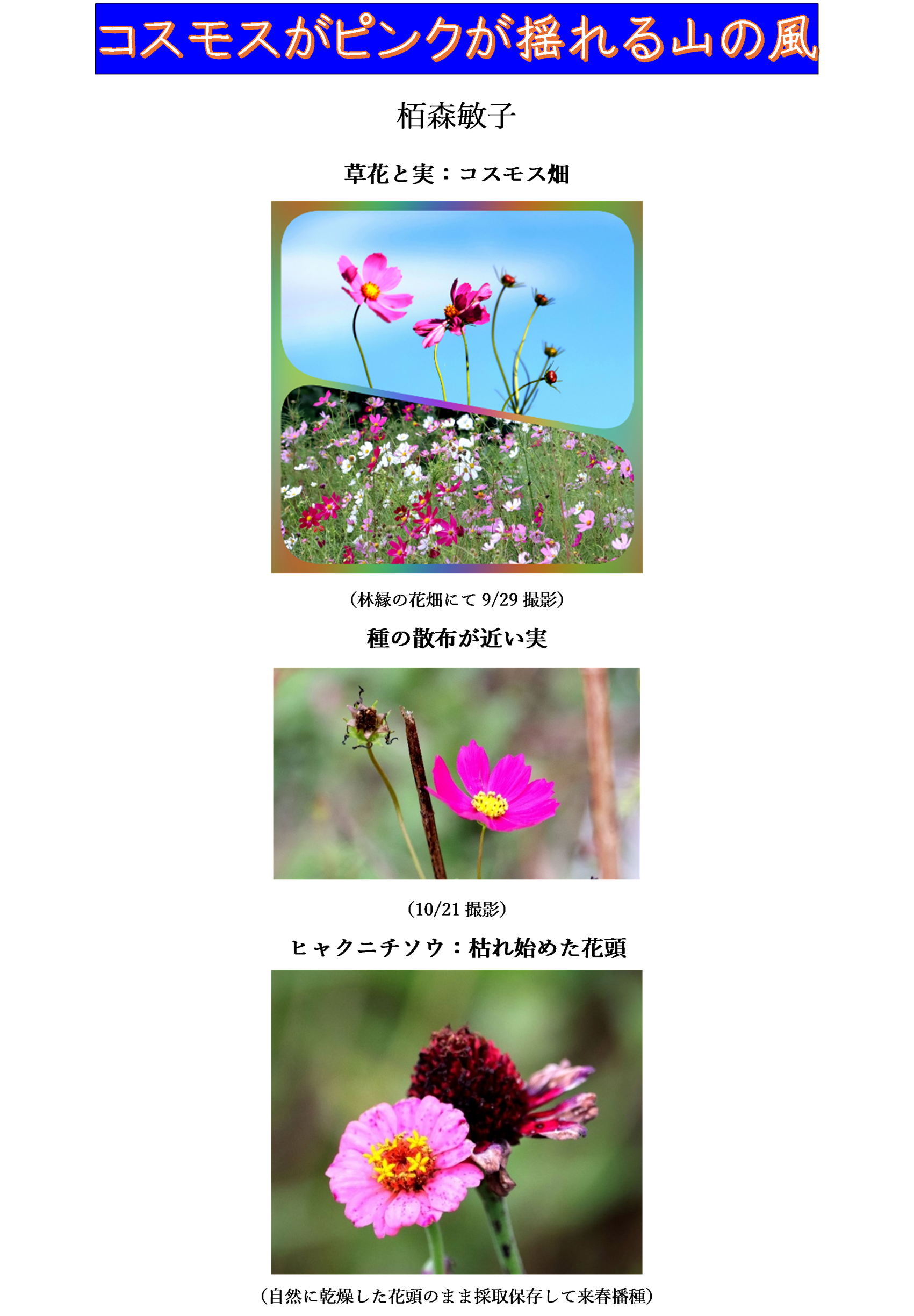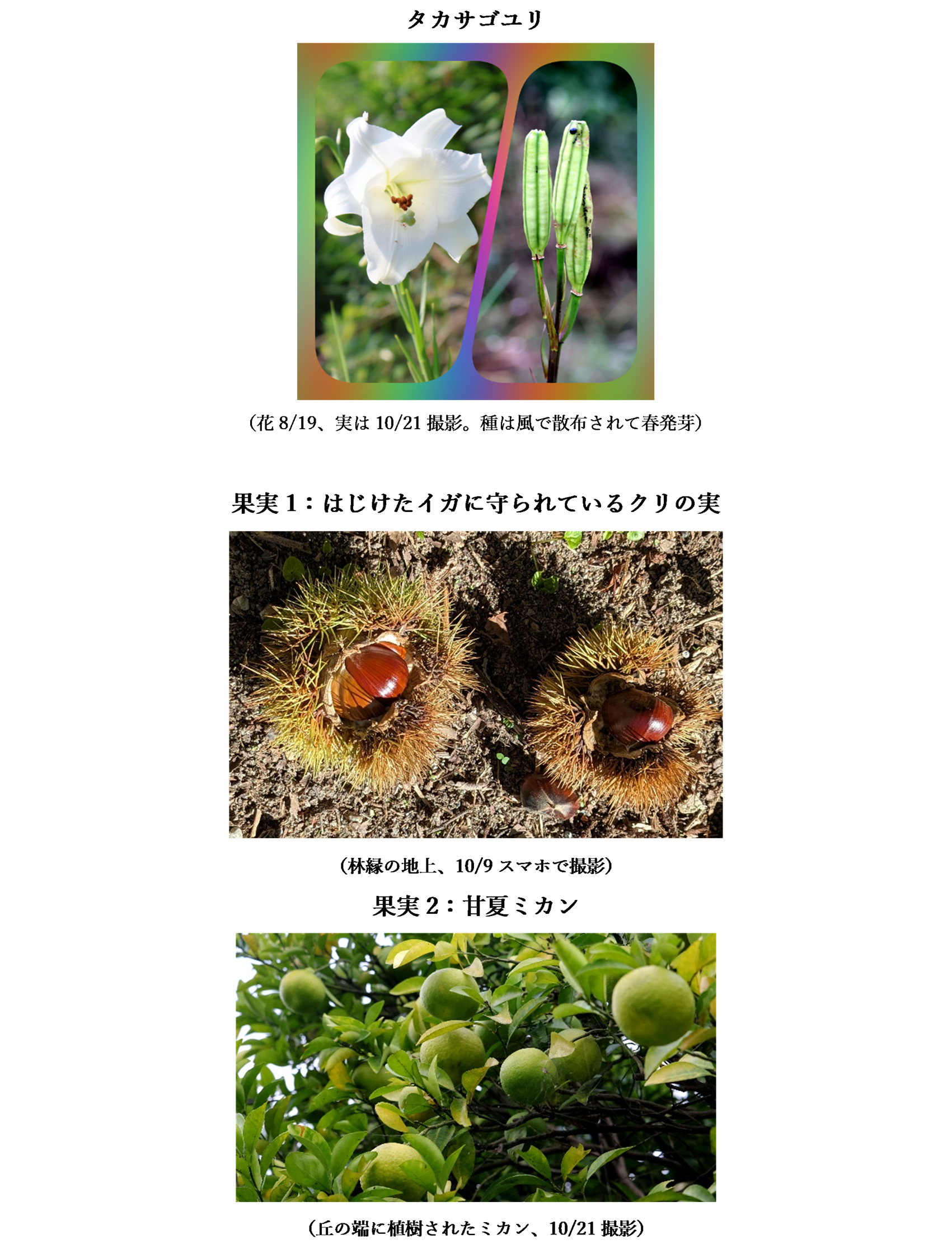 ■本文画像中のキーワード:#コスモス #ヒャクニチソウ #タカサゴユリ #カラスウリ #クリ #甘夏ミカン