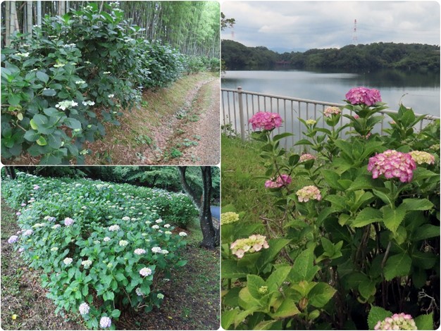 アジサイプロムナード(左上)、登り口(左下)、サイクルロード沿いのアジサイ