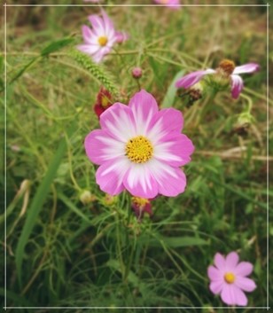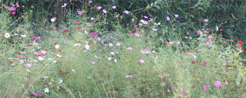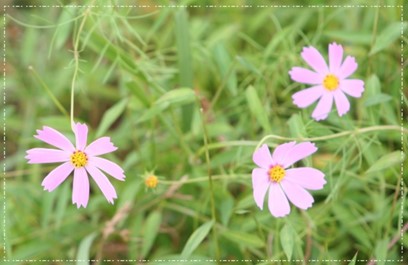 | コスモス、花桃は10月13日町内の野原にて撮影。表題句は『俳誌のsalon』 (http://www.haisi.com/saijiki/Akatonbo1.htm)より。 | ||