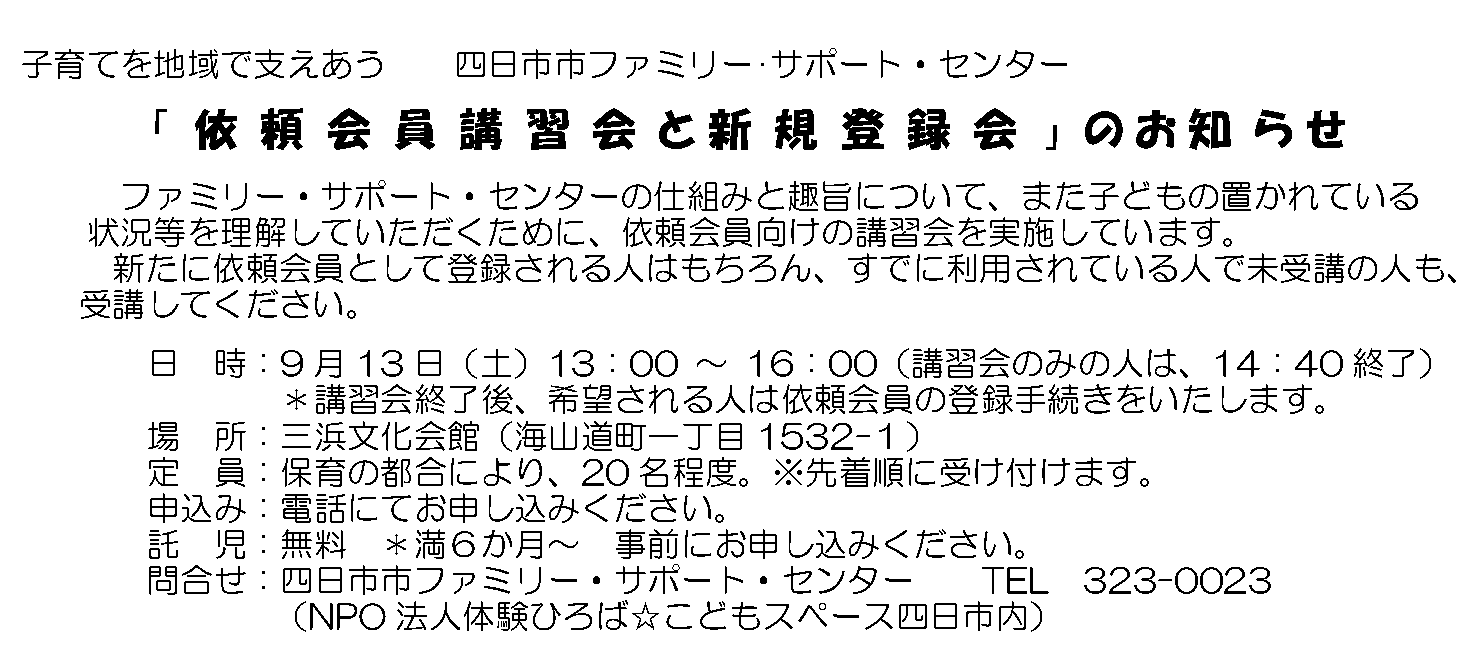 四日市市ファミリー・サポート・センター 「依頼会員講習会と新規登録会」のお知らせ