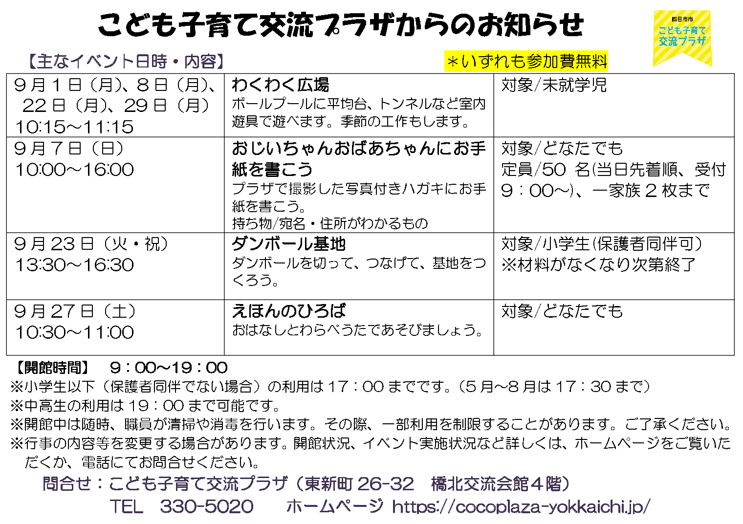 こども子育て交流プラザからのお知らせ