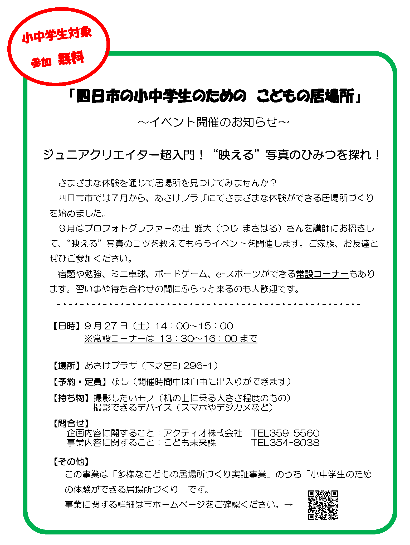 「四日市の小中学生のためのこどもの居場所」~イベント開催のお知らせ~