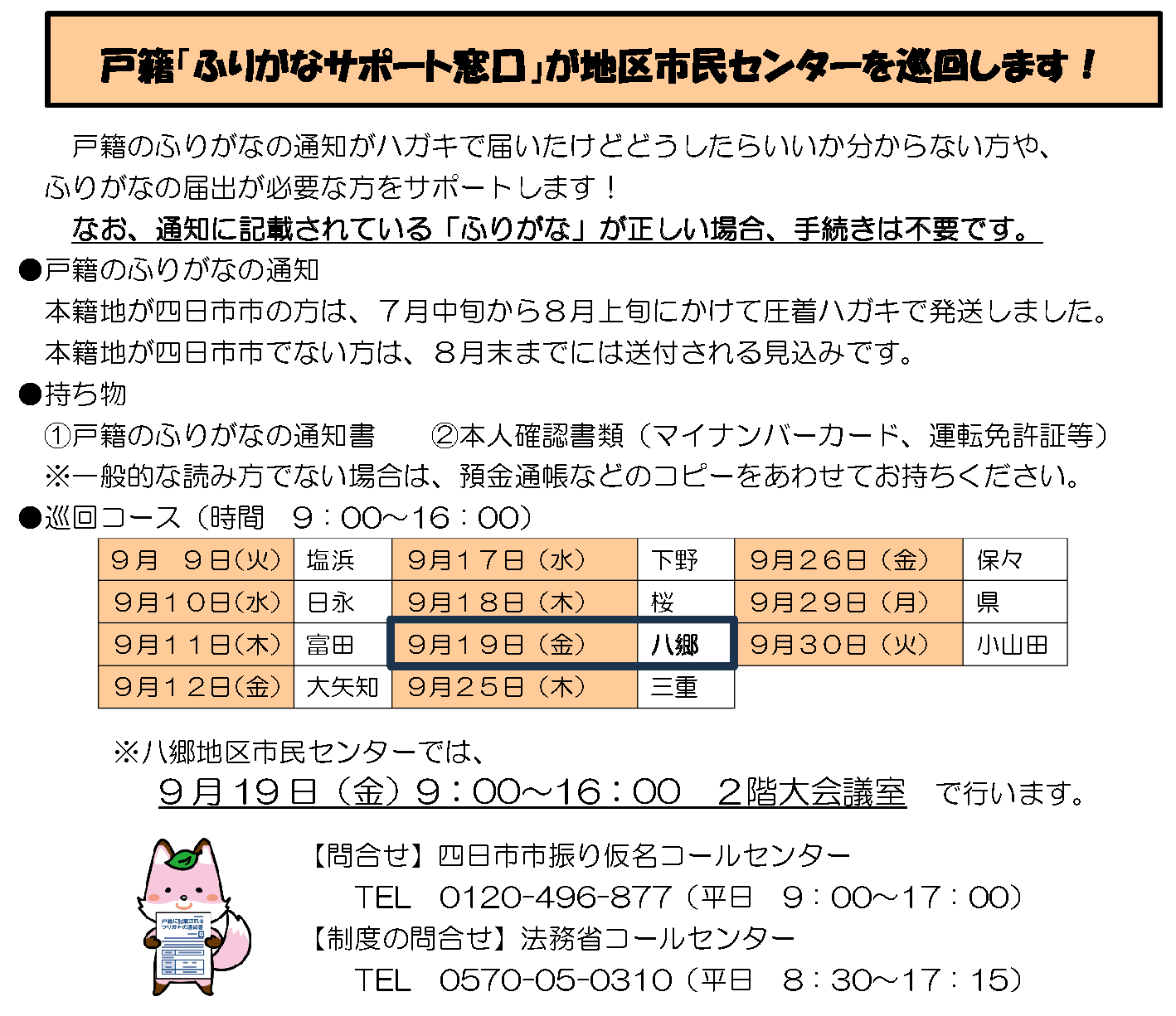 戸籍「ふりがなサポート窓口」が地区市民センターを巡回します!