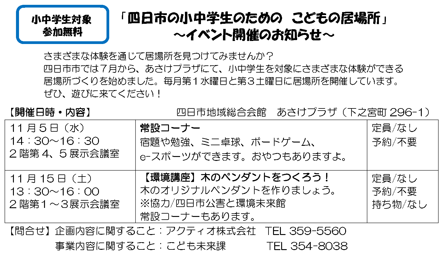 「四日市の小中学生のためのこどもの居場所」~イベント開催のお知らせ~