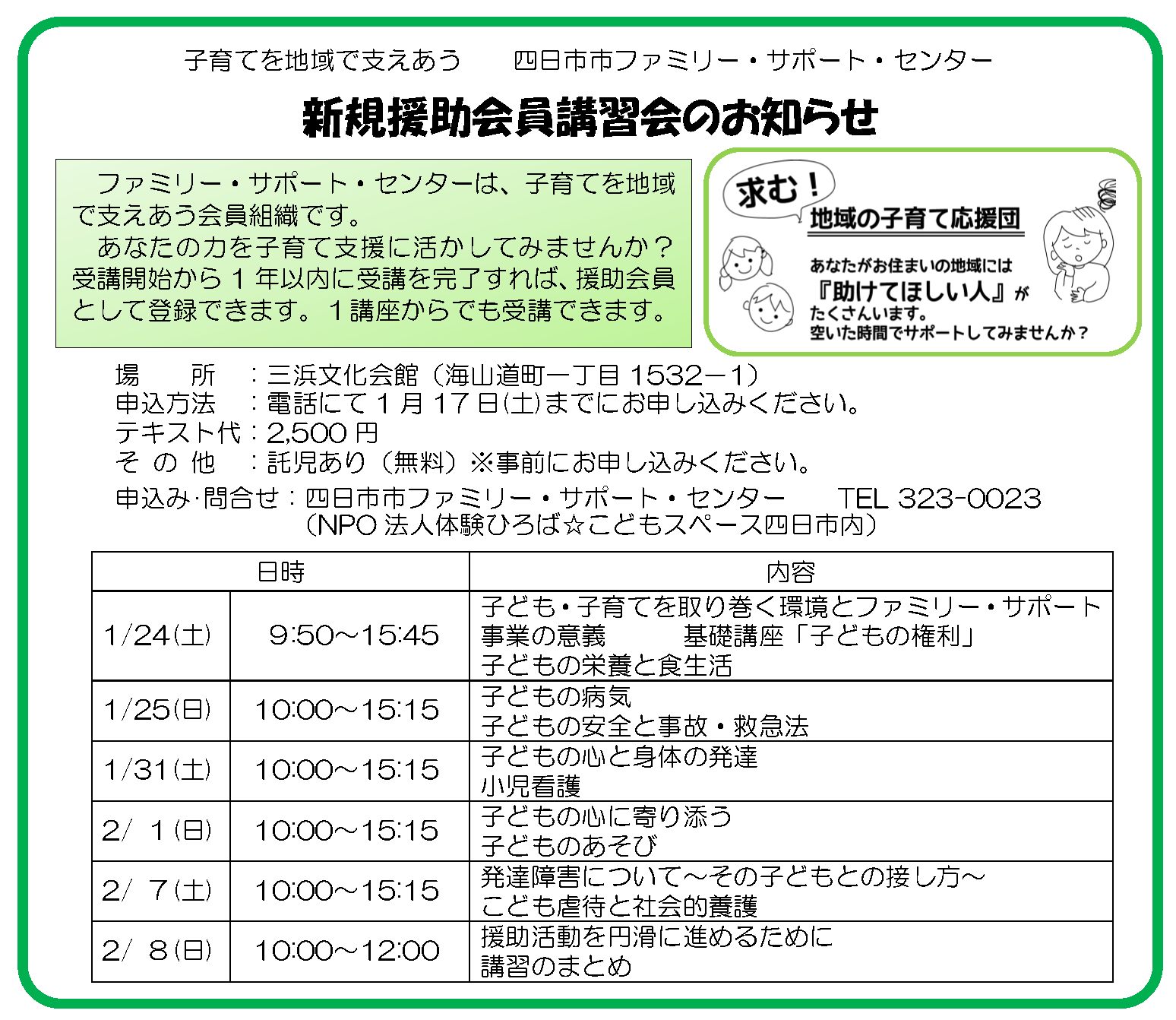 四日市市ファミリー・サポート・センター 新規援助会員講習会のお知らせ