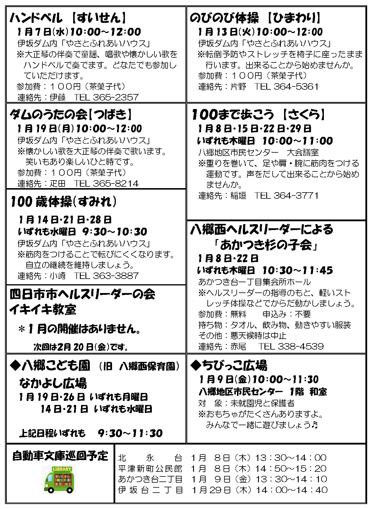 ※場所は変更があります。 伊坂ダム内「八郷ふれあいハウス」にて、ご確認ください。 ※重りを巻いて足や肩・腕に筋肉をつける運動です。 声をだしながら楽しく始められます。 参加費:100円(茶菓子代) 連絡先:ひとみをご覧ください