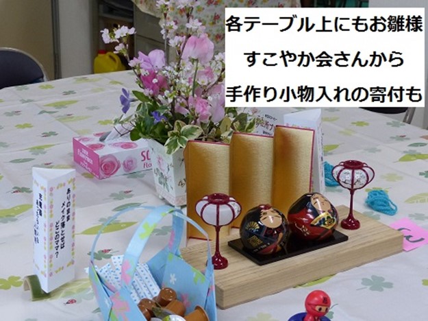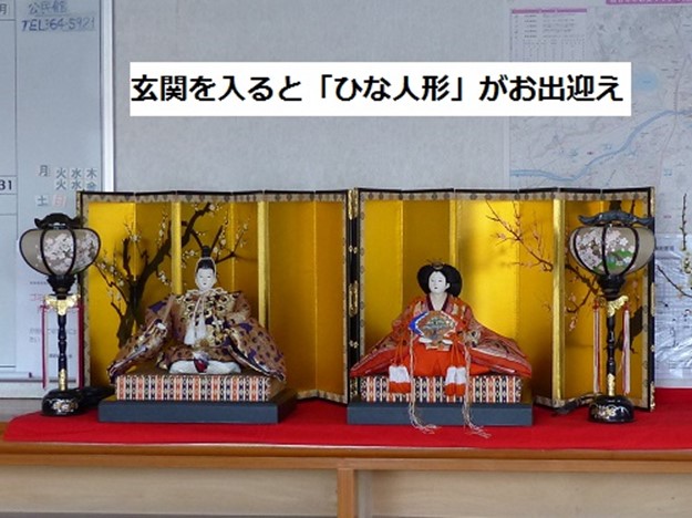 生花や町民の方々作によるちぎり絵やアートフラワー等、そして、数組のお雛様が飾られていました。