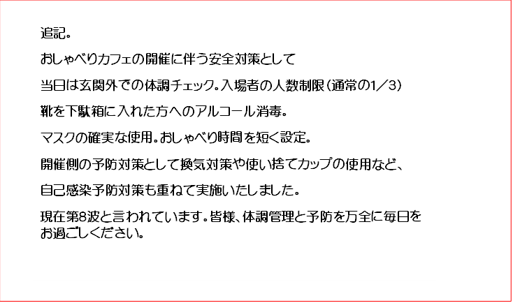 久しぶりにおしゃべりカフェの開店です