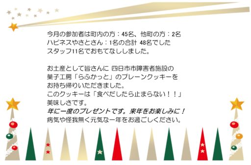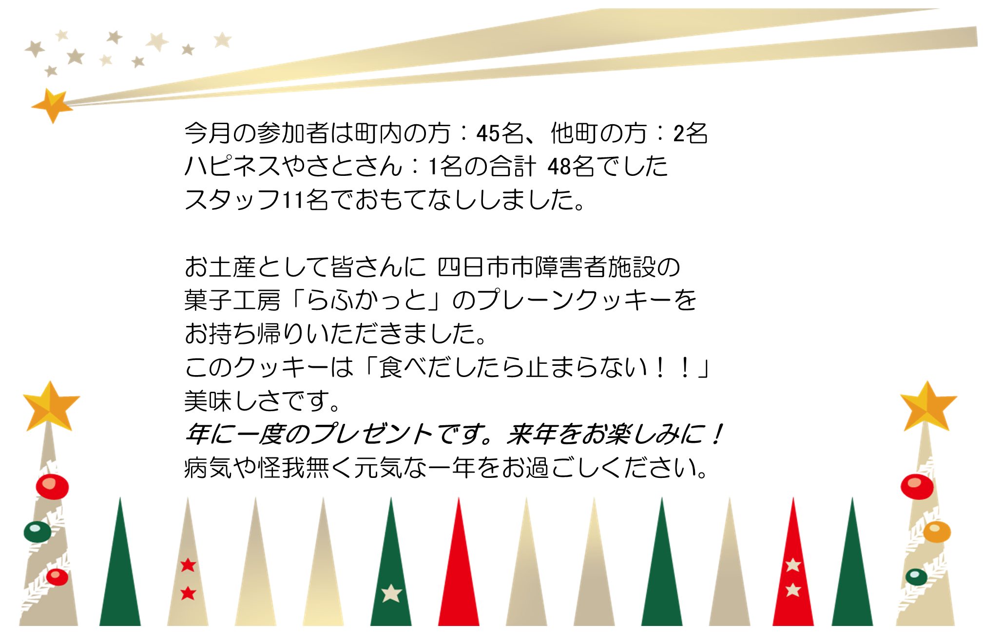 平津新町自治会 おしゃべりカフェ 2025年12月30日 2026年1月2日 12月18日(木)おしゃべりカフェの開店です。 今年最後の開催です。皆さん、お待ちしてますよ。 クリスマス一色の飾りつけですね🌳 いつもと変わらない楽しい会話と笑顔です。 綺麗なタペストリーとお花たち 今回も楽しんでいただけましたか? Facebook postはてブLINEPocketFeedly