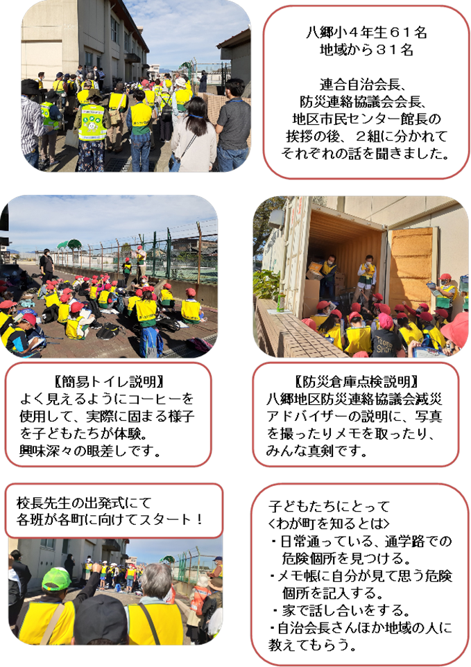 10月16日(金)に、八郷小学校4年生の『子ども防災探検隊』による「まち歩き」がありました。この取り組みは、八郷地区連合自治会と八郷地区防災連絡協議会主催で、八郷小学校の協力のもと行われました。開催に対するねらいは、