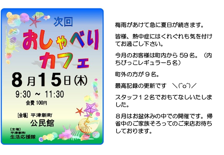 梅雨明け間近の7月18日。今日もおしゃべりカフェは元気に開店です!