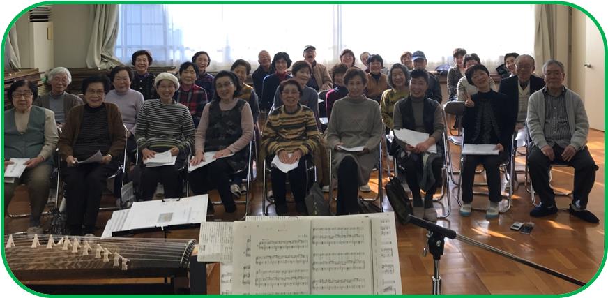 お琴独奏を挟んで、尺八独奏は、『平和の山河』です。これは、流祖である中尾都山が、原爆で廃墟と化した被爆地広島市を訪れた際の印象、死者のご冥福と平和な山河への復興を切に願い、作曲した名曲です。演奏されるHさんの温かいお人柄が音色に出ています。すこやか会のみなさまの心に沁みこむ音色です。そして、みなさまに合わせて歌っていただく曲は、Hさん選曲のこの2曲。『雪の降る街を』『ここに幸あり』