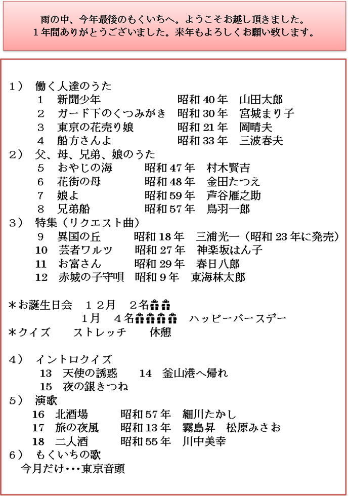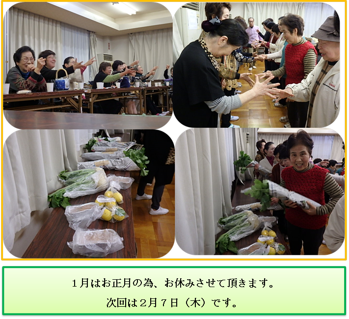 平津新町自治会 12/6(木)平新歌の もくいち 2018年12月23日 2018年12月23日 12月6日(木)の「もくいち」、スタッフの方の言葉と写真で、楽しい様子をお伝えします。(ホントは、楽しいトーク満載だったんだろうなぁ・・・これは、皆さまの(笑)(笑)(笑)の表情からご想像ください) Facebook postはてブLINEPocketFeedly