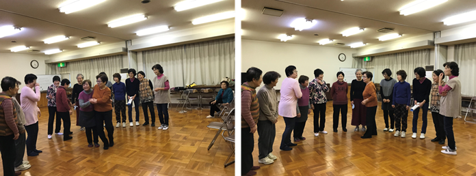 平津新町「すこやか会」では、1月26日(日)に四日市市文化会館第2ホールで開催される『第57回 フロンティア四日市 芸能大会』に出場します。《平新のやる気!元気!で楽しく成功させよう!》と、16名で参加予定です。12月7日と21日に公民館で練習を行いました。