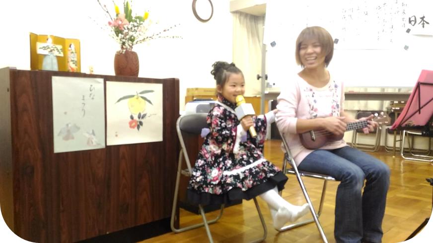 先ずは、先月のブログでお伝えした『可愛いお客さま』の歌披露です。「川の流れのように」と「にじ」の2曲をお母さまのウクレレ伴奏で歌ってくれました。マイクでニコニコ歌う姿に、「かわいい~❤」の声。皆さま、癒されたことと思います。