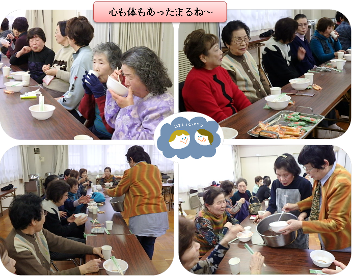 最後は「茶話会」。これも皆さまのお楽しみのひとつ。そして、今日は年初め恒例の『手作りぜんざい』が振る舞われました。『お・も・て・な・し💕』の心が込められたぜんざい、美味しかっただろうなぁ~いいなぁ~(行けなかった者の心の声😢)