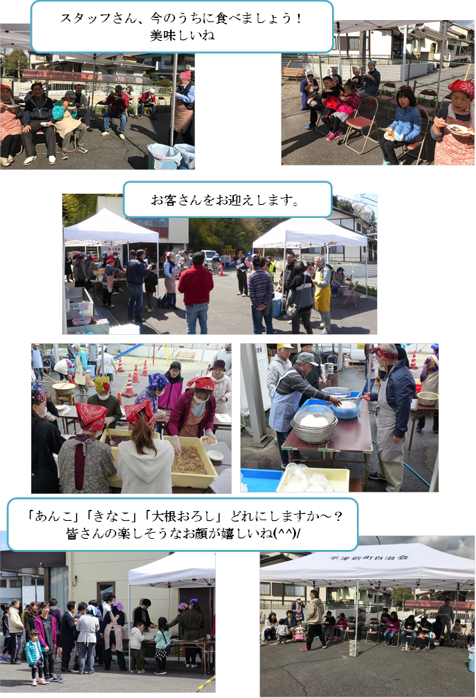 3月31日(日)平津新町公民館にて、『春季 平津新町もちつき大会』が開催されました。「明るく楽しいまちに!」「住民の絆つくりに!」昨年から企画された、もちつき大会、今年も笑顔あふれる楽しい声が公民館に響きました。