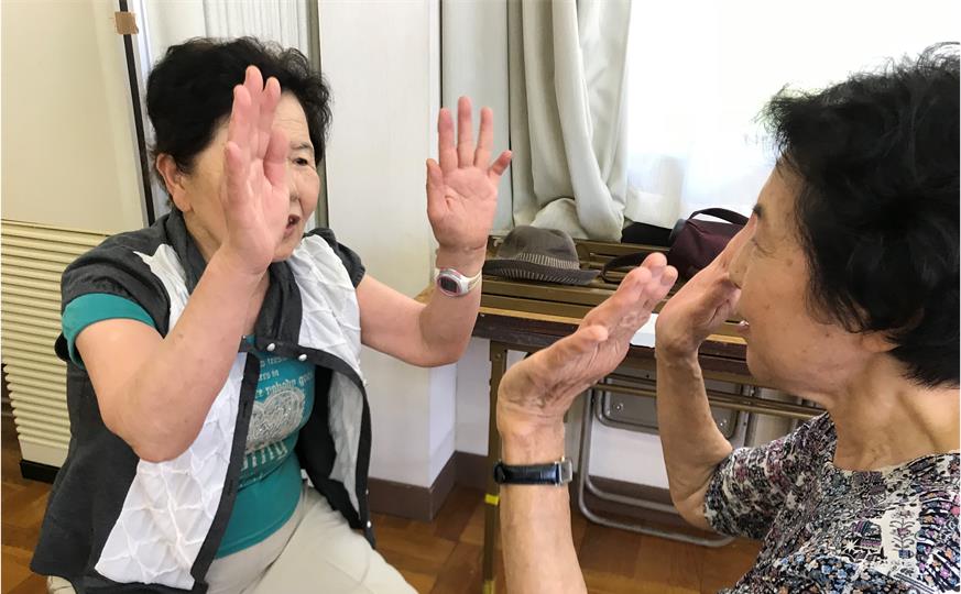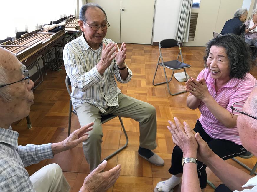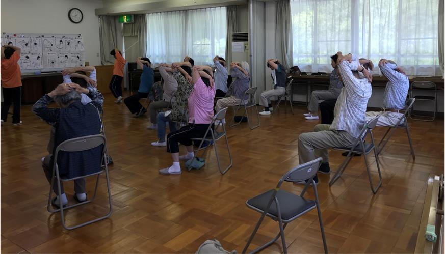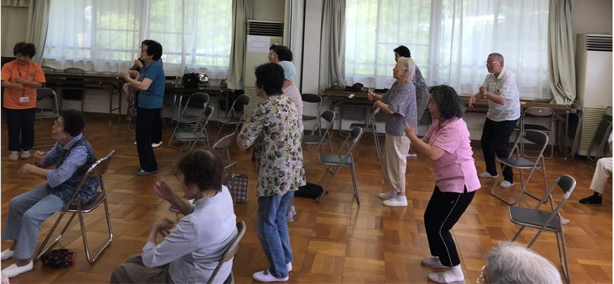 ヘルスリーダーさんの、「みなさんの明るい元気な感じなら、『サザエさん』ですね!」の一言で、振り付き『サザエさん』をしたのですが、リーダーさんより完ぺきな方々も!