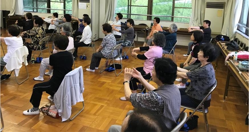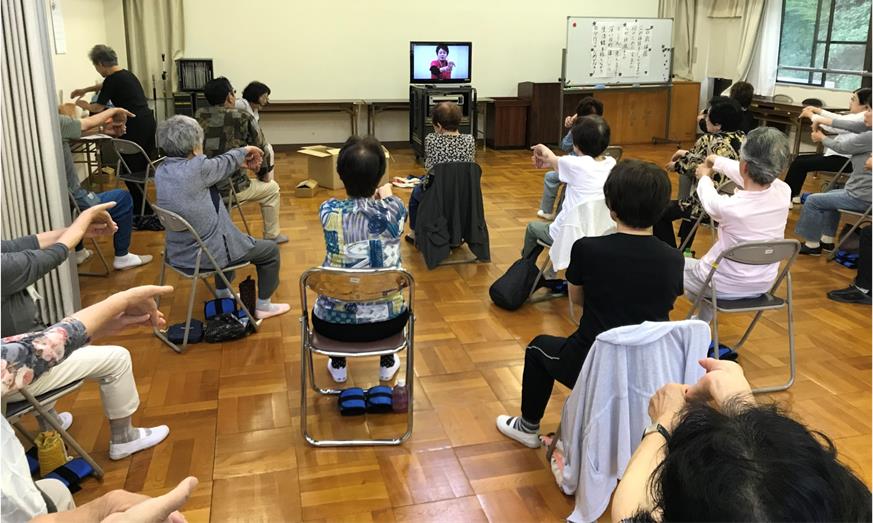6月6日(水)午後1時半から、平津新町公民館2階ホールにて『いきいき百歳体操』が開催されました。公民館の外まで「1・2・3・・・」の元気な掛け声が!ホールでは、ビデオを観ながら真剣に体操する姿。ほとんどの方が、慣れた様子で取り組んでみえました。