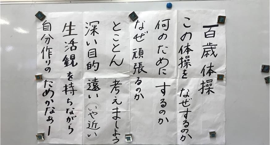 今日は雨。にもかかわらず、ホールいっぱいの参加者。聞けば、口コミでどんどん広がっているとか。「筋力がついてきて体にいいと聞いたので来ました。」という初めての方もみえたそうです。前には今日もこの言葉が貼ってありました☟☟