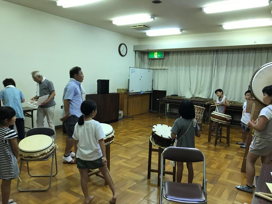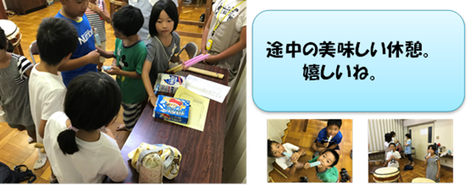 7月23日(月)、夏祭りを盛り上げるための『太鼓打ちの練習』が始まりました。昨年も叩いた子たちは、さすがだね!体が覚えているのですね!どの曲もどんどん叩いています。初めての子は、先生に教えていただいたり、子ども先生の真似をしたりで覚えていきます。