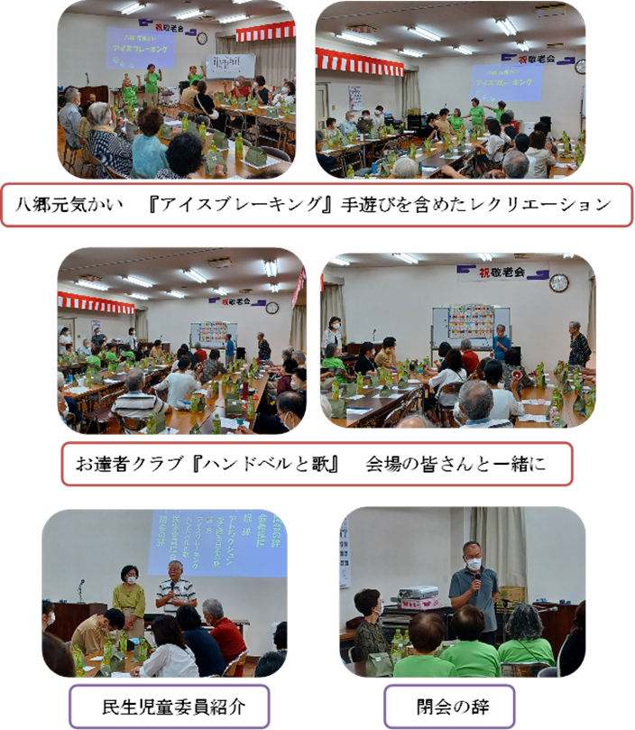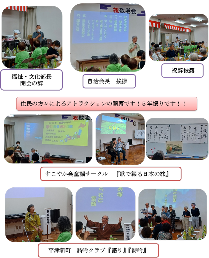 9月7日(土)、平津新町公民館にて『平津新町敬老会』が開催されました。今年は、住民の方々によるアトラクションが5年ぶりに催され、とても楽しく温かい敬老会となりました。