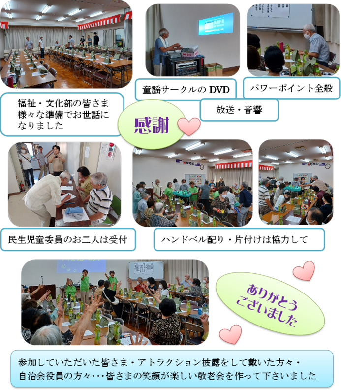 敬老会開催にあたり、お世話になった方々のご紹介もさせていただきます。おつかれさまでした。ありがとうございました。