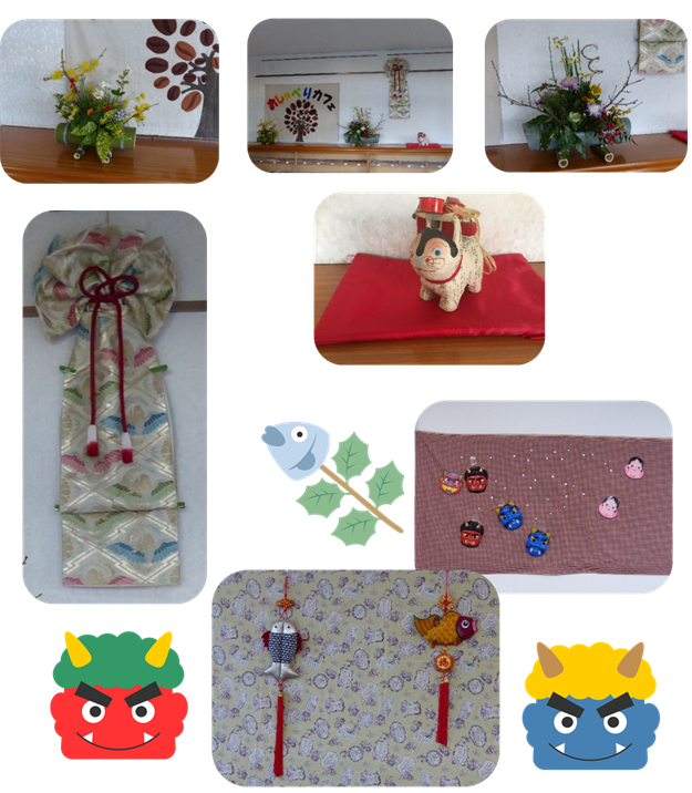 玄関には帯を使った綺麗な飾り付けと可愛い張子の犬。