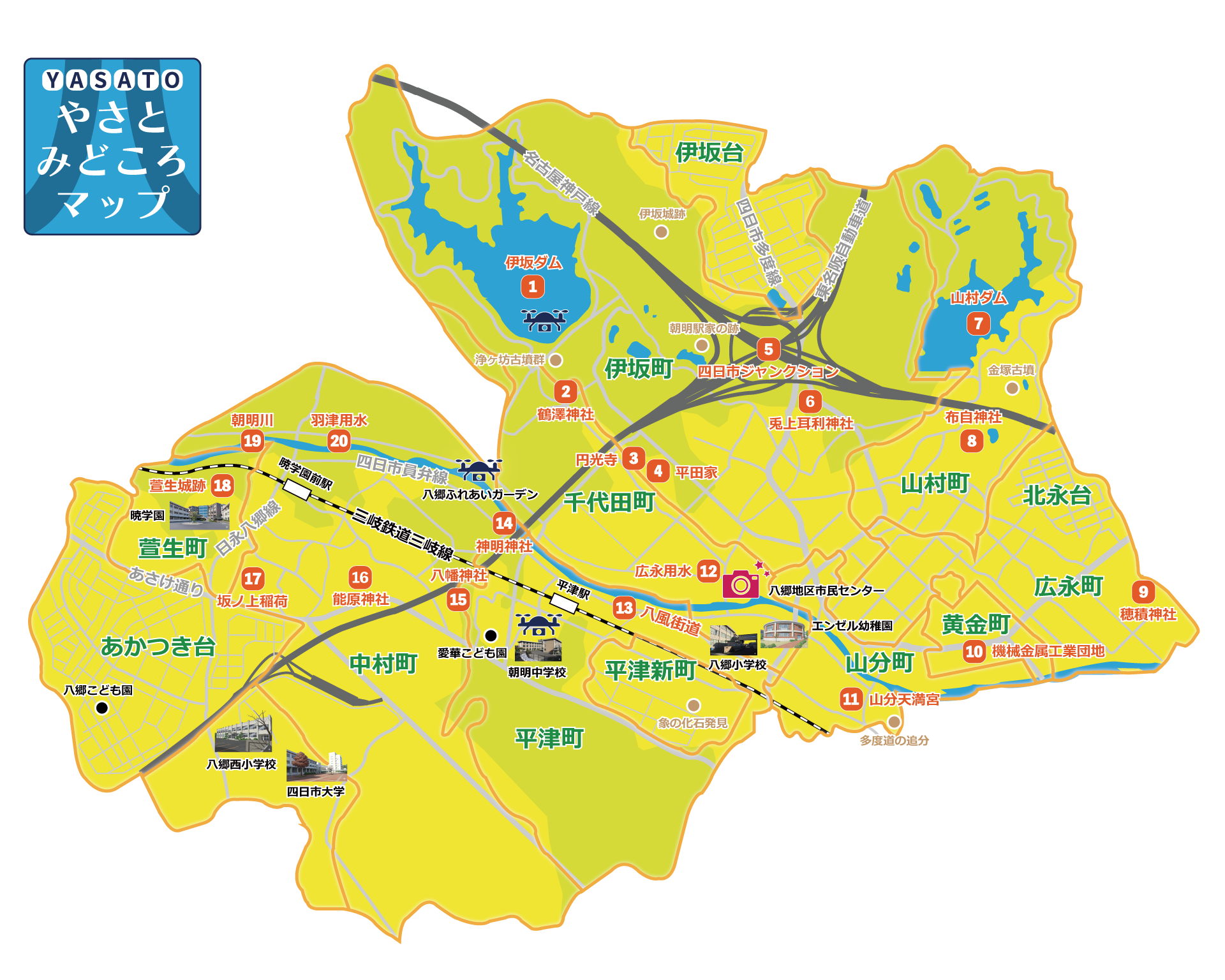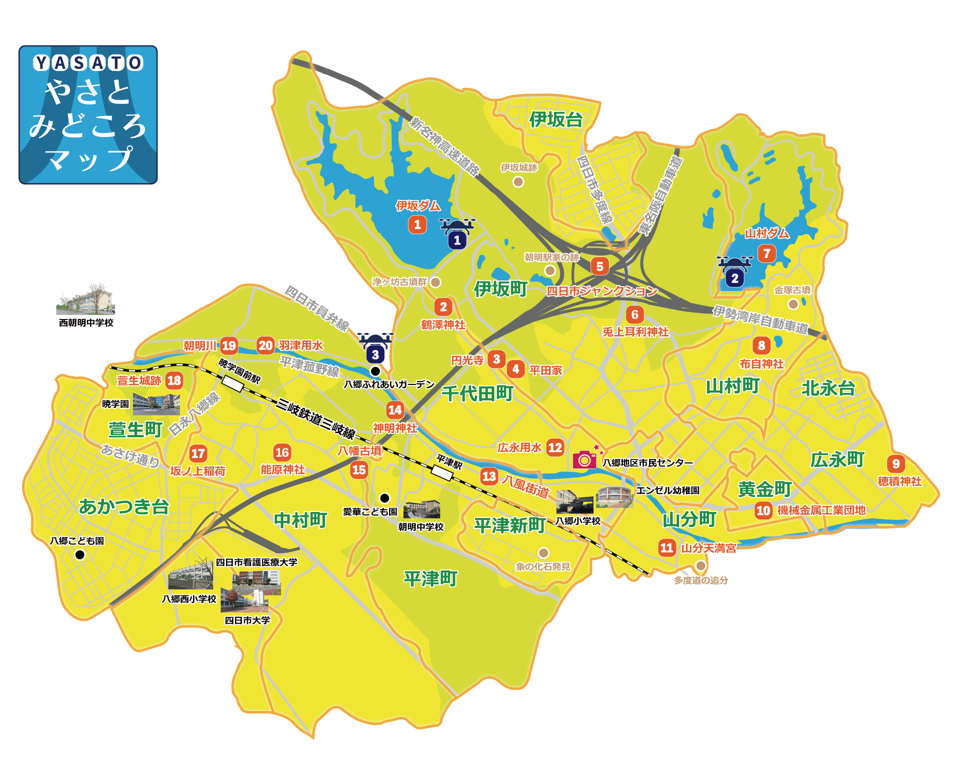 地図内の番号やアイコンをクリック(タップ)すると各スポットの詳細や写真・ドローン映像が見れます。